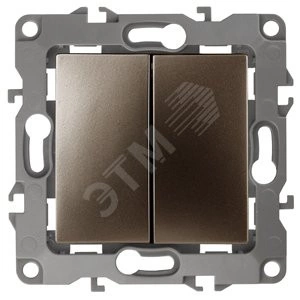 Выключатель 2-клавишный проходной серии Эра 12 скрытой установки механизм цвет бронза 12-1106-13. Номинальные характеристики 10А 250В . Сделан из поликарбоната, оснащено автоматическими клеммами для быстрой и надёжной фиксации жил кабеля в механизме. Парные клеммы обеспечивают соединение шлейфом. Монтаж в подрозетник производится и на лапки, и на винты. Рамки приобретаются отдельно. Рамки Эра 12: 1 пост 12-5001-хх, 2 поста 12-5002-хх, 3 поста 12-5003-хх, 4 поста 12-5004-хх, 5 постов 12-5005-хх. Рамки Эра 12 Сатин: 1 пост 12-5101-хх, 2 поста 12-5102-хх, 3 поста 12-5103-хх, 4 поста 12-5104-хх, 5 постов - 12-5105-хх (хх - код цвета: 01-белый, 02-слоновая кость, 03-алюминий, 04-шампань, 05-антрацит, 06-чёрный, 07-ольха(белёный дуб-сатин), 08-вишня, 09-дуб, 10-венге, 11-сосна, 21-жёлтый, 22-оранжевый, 23-красный, 24-охра, 25-бордо, 26-лайм, 27-зелёный, 28-голубой, 29-синий).