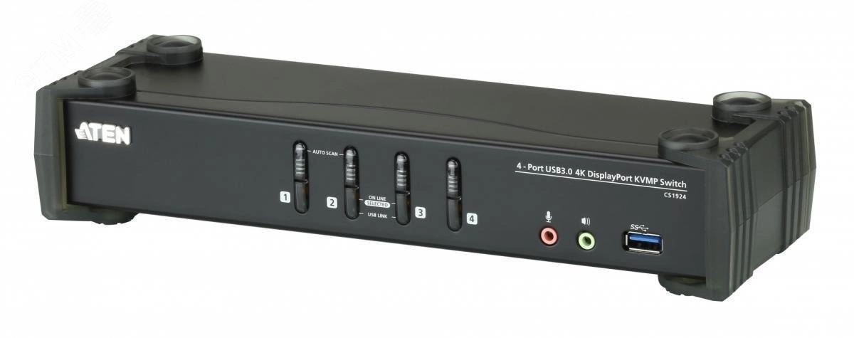 KVM переключатель ATEN CS1924 сочетает в себе самые последние инновации в технологиях для настольных KVM-переключателей. KVMP Переключатель CS1924 обладает беспрецедентной производительностью при воспроизведении видеопотока с разрешением 4K, оснащен концентратором следующего поколения USB 3.1 Gen 1 со скоростью передачи данных 5 Гбит/с, а также расширенными и удобными возможностями управления. Переключатель позволяет пользователям получить доступ к четырем компьютерам с интерфейсом DisplayPort, используя консоль с одной USB-клавиатурой, USB-мышью и монитором. Обладая легкостью в управлении коммутатор CS1924 предоставляет возможность использования трех удобных способов переключения - с помощью кнопок на передней панели, мыши или комбинации клавиш с клавиатуры, обеспечивая гибкий доступ к любому подключенному компьютеру.