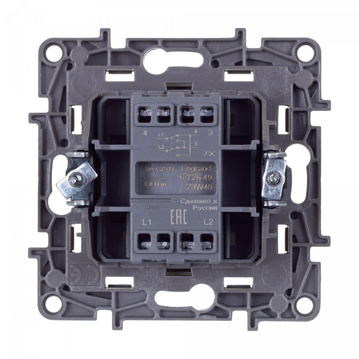 Переключатель промежуточный (перекрёстный) одноклавишный Legrand Etika для скрытого монтажа, цвет ''Антрацит'', номинальный ток 10АХ, напряжение ~250В. Предназначен для использования в схемах управления нагрузками с трёх и более мест. Применяется совместно с переключателями на два направления (проходными). Устанавливается в жилых и общественных помещениях для управления приборами освещения, вентиляции и т.д.