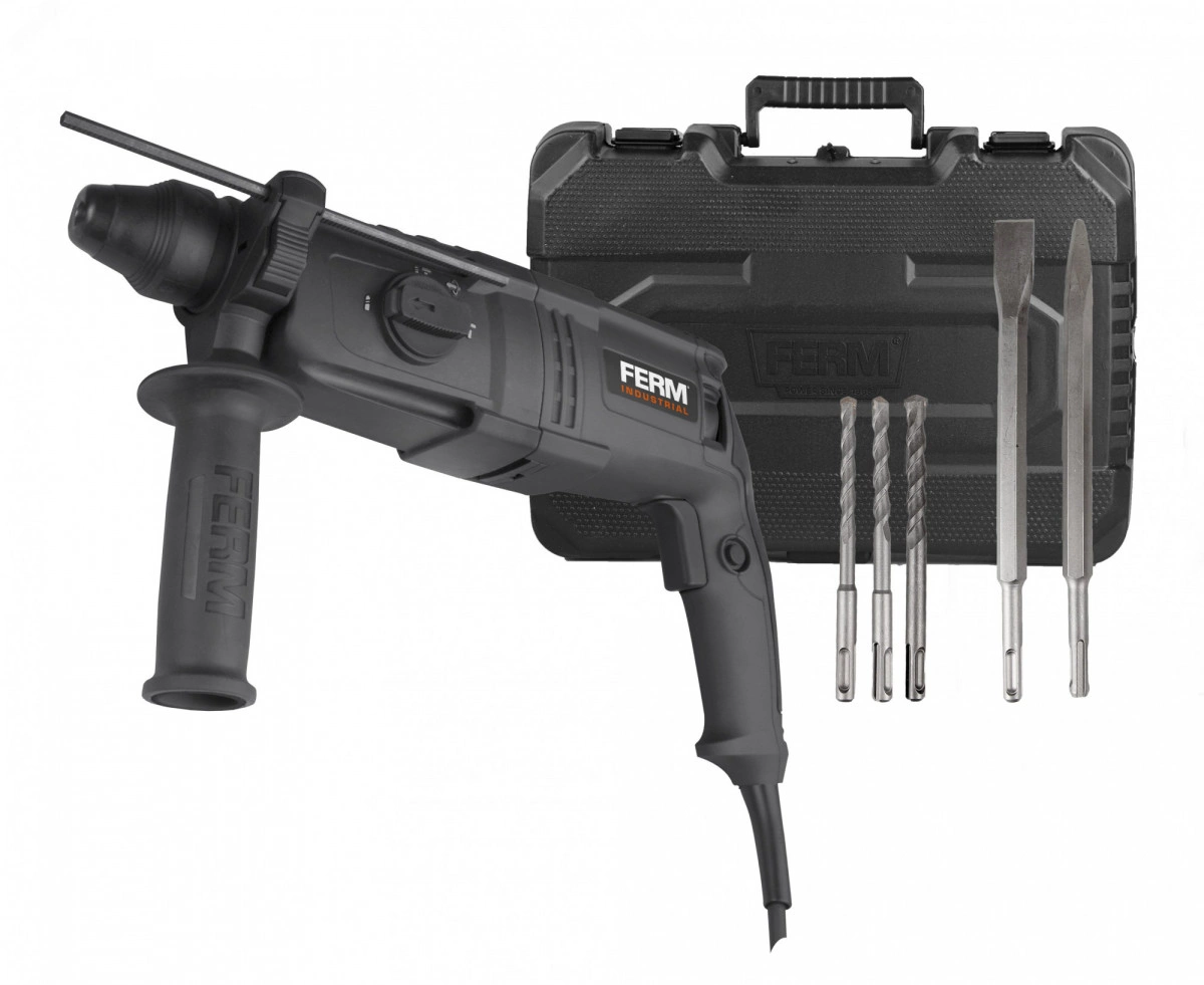 Перфоратор FERM HDM1038P сверлит быстро и точно отверстия в бетоне, кирпиче и аналогичных материалах. Мягкая рукоять гарантирует удобный и надежный хват. Электронная регулировка оборотов помогает выбрать оптимальную скорость для работы в зависимости от плотности материала и диаметра оснастки. Сетевой кабель длиной 3 м дает возможность работать на дальнем расстоянии от розетки. Преимущества - - Патрон SDS-plus для простой смены оснастки - Регулировка частоты вращения - для точной настройки под разные материалы - Реверс предусмотрен для легкого извлечения застрявшего бура - Длинный сетевой кабель для свободного перемещения по рабочей площадке - Мягкие накладки на рукоятках способствуют удобному удержанию инструмента - Для сверления отверстий нужной глубины в комплекте предусмотрен ограничитель - Удобный кейс решает вопрос хранения и транспортировки FERM HDM1038P.