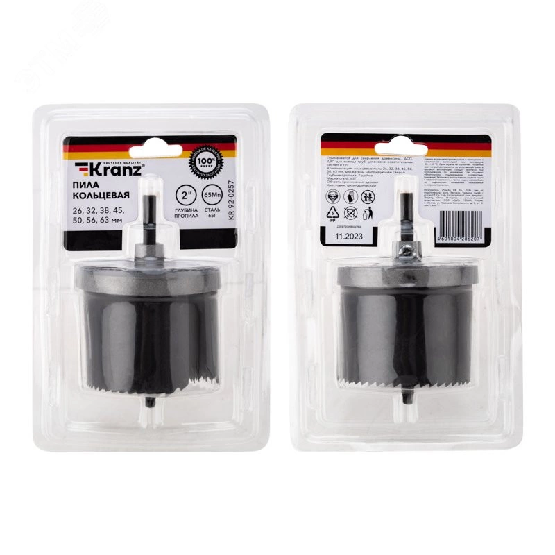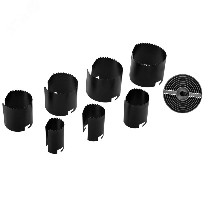 Кольцевая пила состоит из держателя и коронок диаметром 26, 32, 38, 45, 50, 56, 63 мм, позволяющих вырезать круглые отверстия глубиной до 1 дюйма в дереве, ДВП и ДСП. Пила применяется при проведении работ по выводу труб через перегородки, а также при установке осветительных систем, розеток и выключателей. Используется в качестве оснастки для ручных и электрических дрелей. Хвостовик – цилиндрический. Режущие полотна изготовлены из высокоуглеродистой марганцевой стали марки 65Г. Инструмент комплектуется направляющим сверлом, облегчающим центровку отверстия. На корпус держателя нанесены обозначения диаметров, что упрощает установку коронок. По окончании работ все полотна вставляются в держатель, что обеспечивает удобство хранения. В комплект входят кольцевые пилы диаметром 26, 32, 38, 45, 50, 56, 63 мм, держатель, центрирующее сверло.