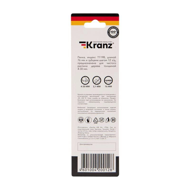 Пилка для электролобзика по дереву T119B 76мм 12 зубьев на дюйм 4-30мм (уп.2шт) Kranz KR-92-0310