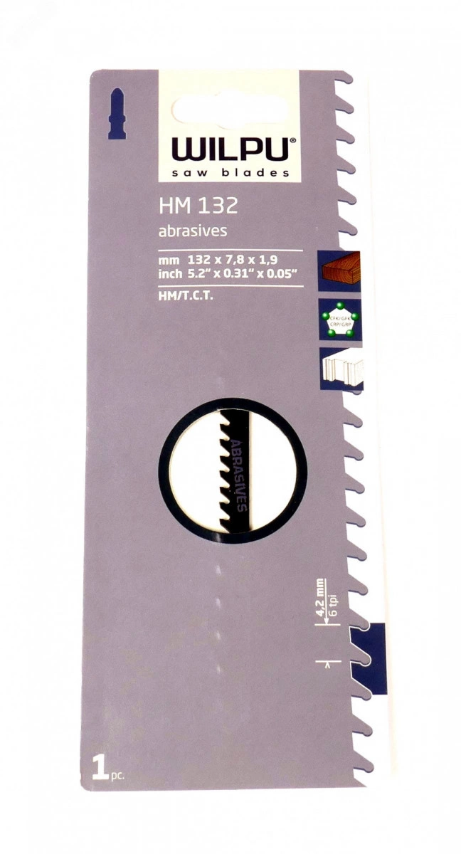 Пилка HM 132 Т341НМ WILPU 289500001 является сменным элементом для лобзиков. Применяется для реза по твердой и мягкой древесине, древесностружечным плитам, пластмассам усиленным стекловолокном и газобетону. Имеет зубья из твердого сплава - HM.Материал - HM T.C.T.Шаг зубьев, мм - 4,2.Длина реза, мм - 105.Размеры, мм - 132х7,8х1,2.Количество - 1 шт.
