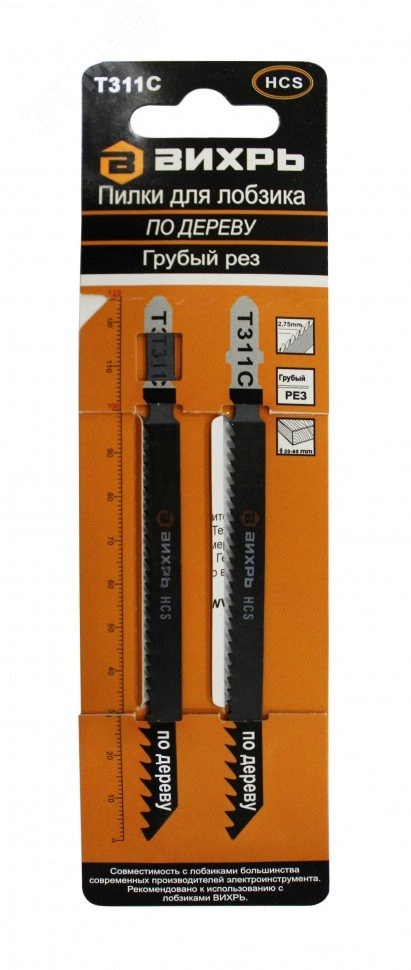 Пилки для лобзика Вихрь Т311C поставляются в количестве двух штук в удобном герметичном блистере. Применяются грубого реза по дереву. Изделия производятся из высокоуглеродистой стали HCS, отличающейся твердостью, невосприимчивостью к коррозии и износостойкостью. Пилки оснащены T-образным хвостовиком, способствующим совместимости с большинством лобзиков.