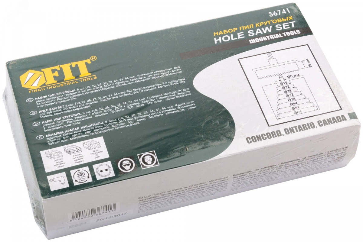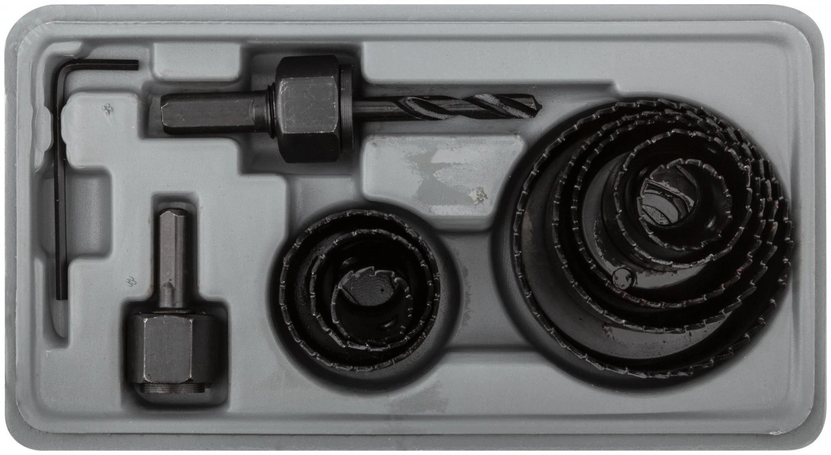 Усиленный адаптер. Профи. Для высверливания отверстий в древесине твердых и мягких пород, ДСП и фанере. В наборе 8 пил круговых - 19, 22, 28,32, 38, 44, 51 и 64 мм. Материал - термообработанная усиленная инструментальная сталь. Упаковка - пластиковый кейс.