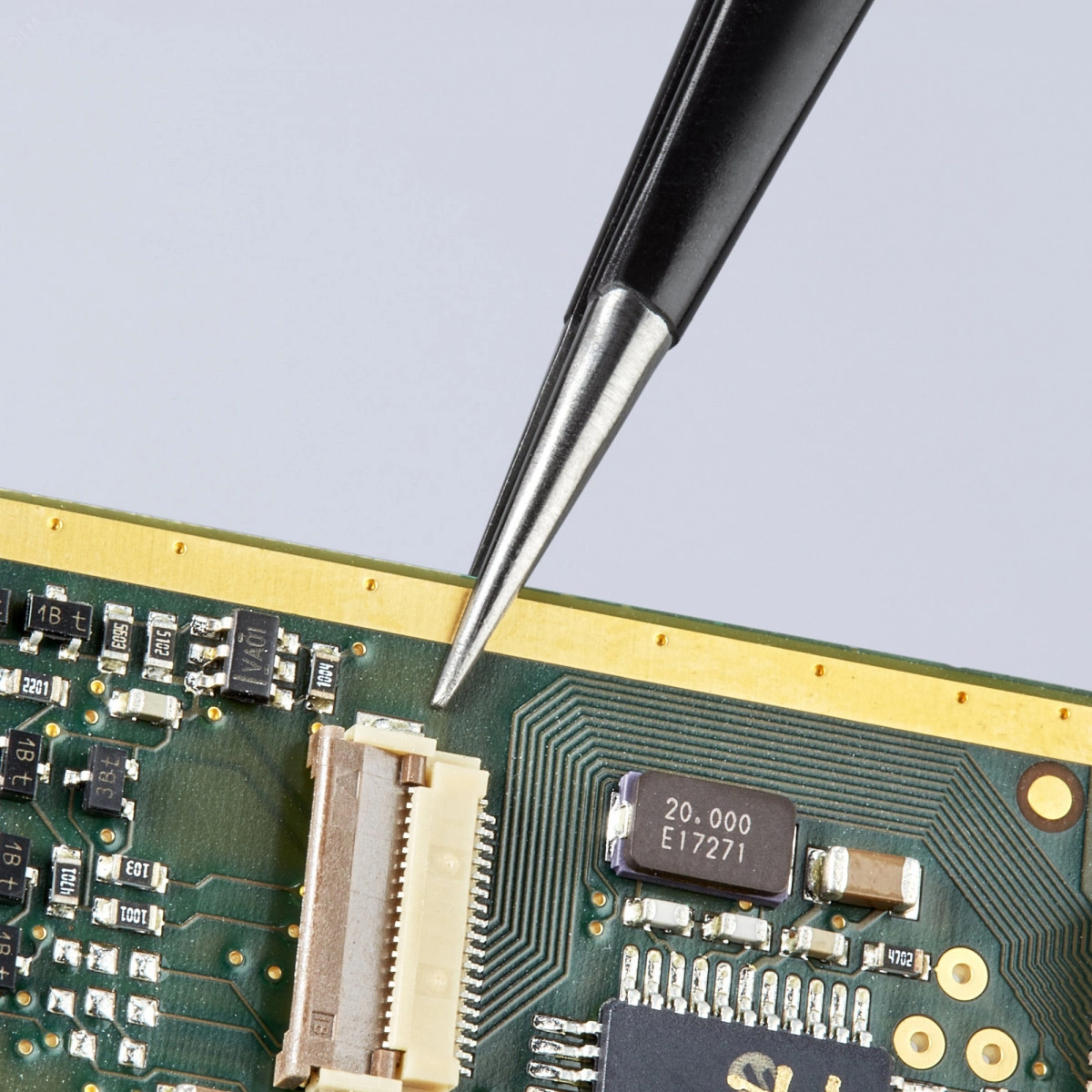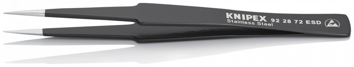 Универсальный пинцет ESD Безопасная работа с электронными компонентами в прецизионных областях применения - пинцет контролируемым образом компенсирует разность потенциалов между оператором и компонентом. Покрытие из черной эпоксидной смолы, прошедшее испытания на электростатический разряд, с поверхностным сопротивлением в диапазоне 10 в 4-ой - 10 в 9-ой Ом. Для электроники и прецизионного приборостроения. Антимагнитные характеристики, чтобы избежать электромагнитного повреждения. Широкий выбор вариантов конструкции - прямые, угловые, с гладкими или шершавыми захватными поверхностями и ручками, со вставочными иглами, с узкими или тупыми наконечниками. Высококачественная нержавеющая сталь обеспечивает чрезвычайную жесткость и очень хорошую коррозионную стойкость в различных атмосферных средах и со многими коррозионными материалами