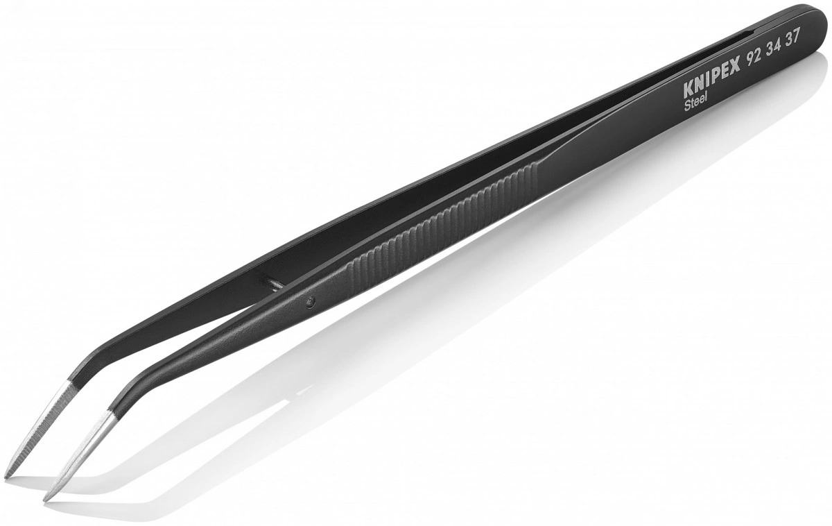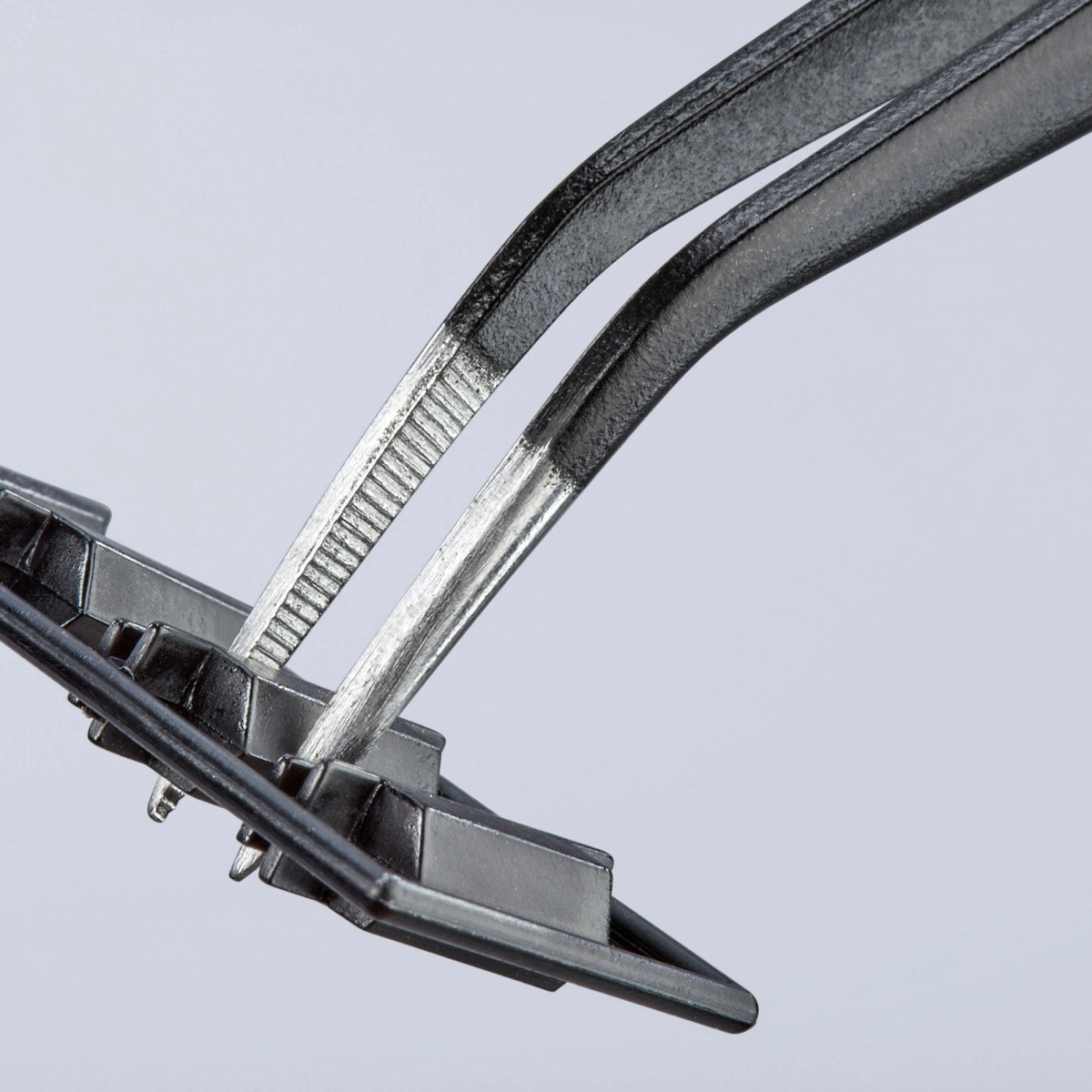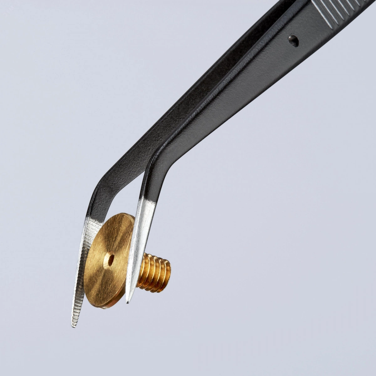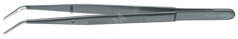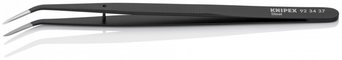 Пинцет захватный прецизионный с направляющим штифтом тонкие зазубренные губки под 45° L-155 мм пружинная сталь чёрная матовая лакировка KN-923437