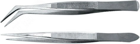 Для захвата и удержания мелких деталей при ремонтных работах. Пинцет прямой, пинцет изогнутый под углом 45 гд. Материал - инструментальная сталь. Уп - п/э пакет с картонным подвесом.