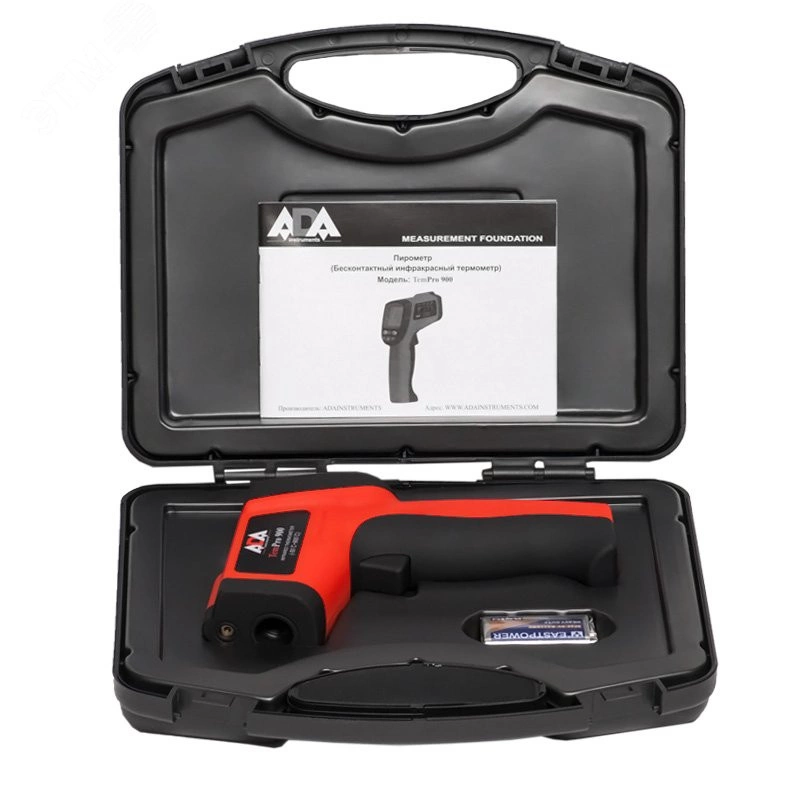 Пирометры ADA TemPro — серия высококачественных пирометров. ADA TemPro 900 средне-температурный инфракрасный пирометр для проведения промышленных температурных измерений обеспечивает бесконтактное измерение температур в диапазоне от ?50 градусов по Цельсию до +900 градусов по Цельсию с точностью ±1.5 градусов по Цельсию. Пирометр ADA TemPro 900 обладает достаточным оптическим разрешением 12 - 1 для измерений на удалении. Пирометр позволяет определять места перегрева, фиксировать максимальное и минимальное значения, усреднять измеренные значения, определять разницу между заданным значением температуры и измеренным, производить запись измеренных значений. Пирометр ADA TemPro 900 компактный инфракрасный пирометр пистолетного типа, максимально удобен в применении. Простое измерение — одним нажатием на 'курок'. Лазерный целеуказатель позволяет выполнять быстрые, точные измерения, 'точно в цель'.