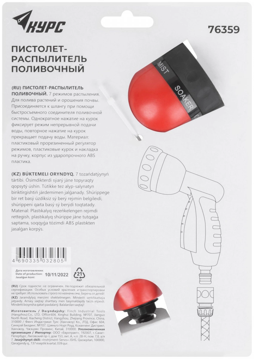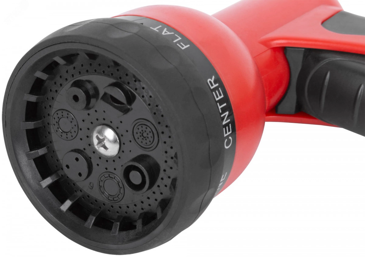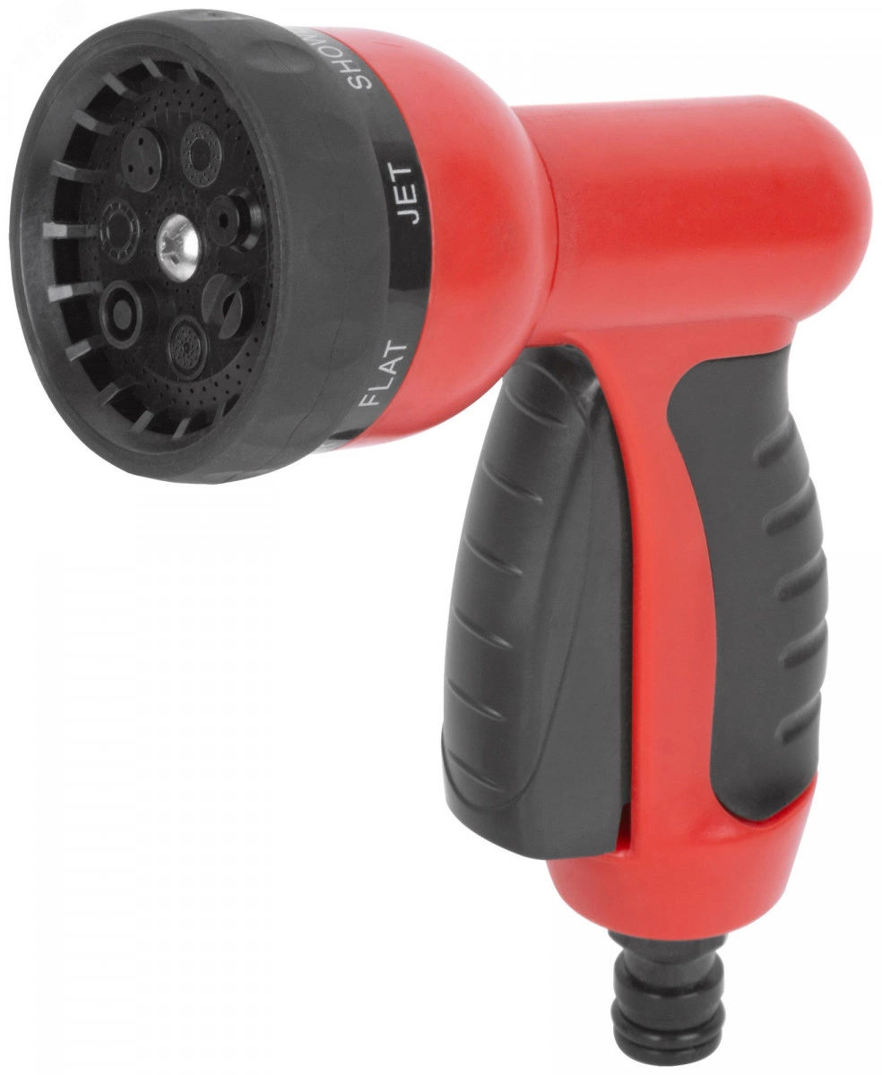 Семь режимов распыления. Однократное нажатие на курок фиксирует режим непрерывной подачи воды, повторное нажатие на курок прекращает подачу воды. Универсальное быстросъемное соединение. Материал - пластиковый прорезиненный регулятор режимов, пластиковые курок и накладка на ручку, корпус из ударопрочного ABS пластика. Упаковка - картонный подвес.