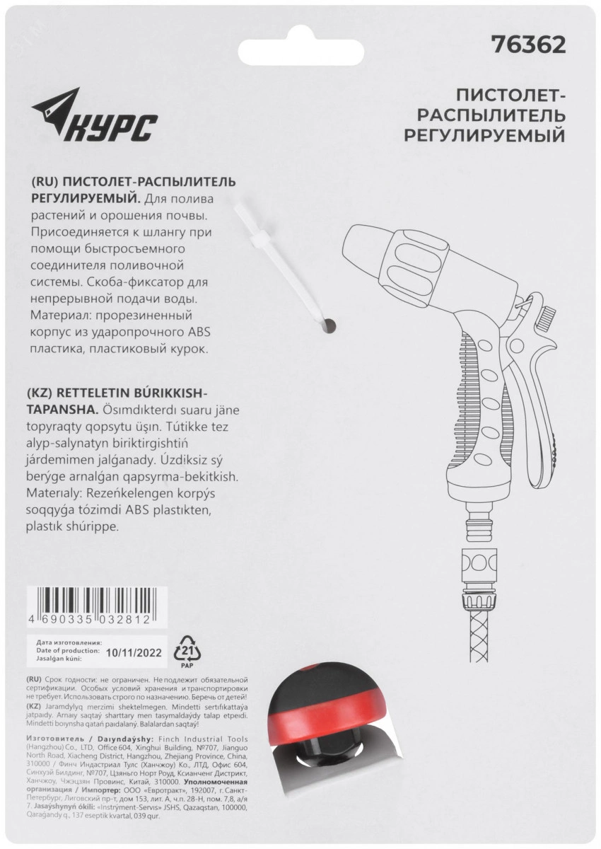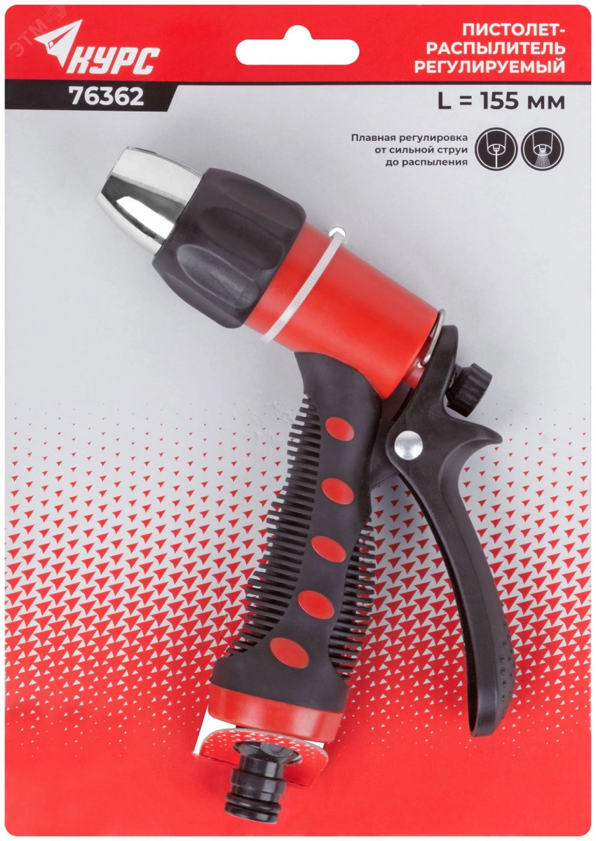 Для полива растений и орошения почвы. Поворотное сопло позволяет регулировать подачу воды от струи до распыления. Скоба-фиксатор для непрерывной подачи воды. Универсальное быстросъемное соединение. Материал - прорезиненный корпус из ударопрочного ABS пластика, пластиковый курок. Упаковка - картонный подвес.