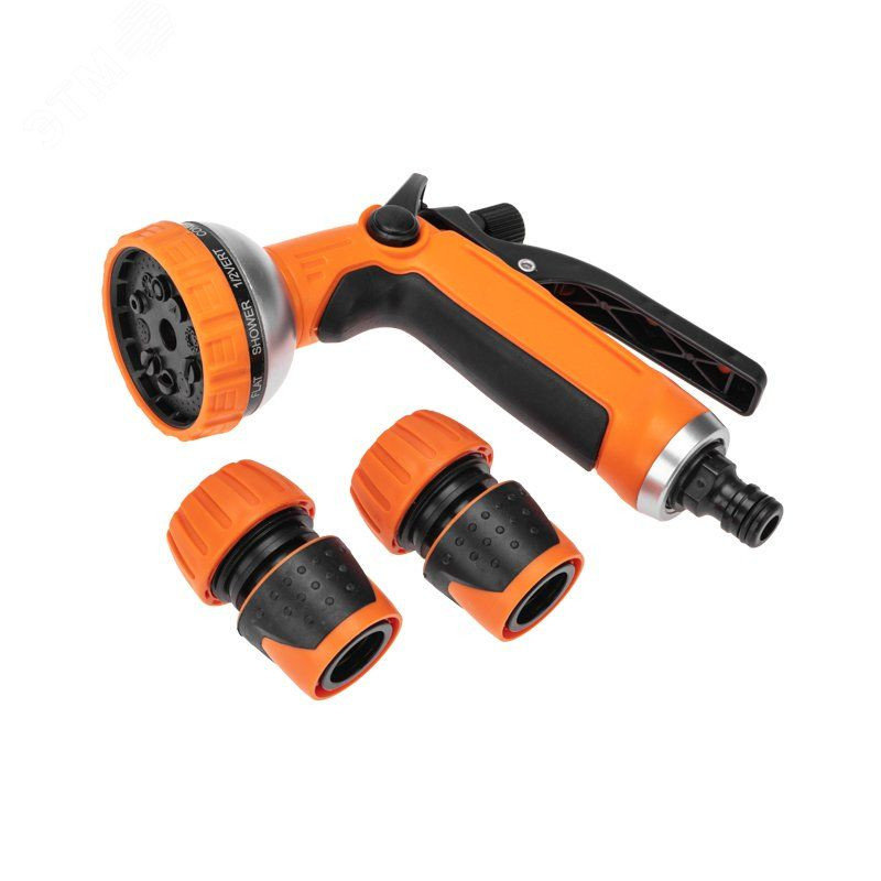 Пистолет-распылитель представляет собой садовый аксессуар, предназначенный для полива растений и почвы. Выполнен из качественного и прочного пластика, устойчивого к воздействию внешних факторов. Устройство оснащено эргономичной ручкой, благодаря которой пистолет удобно и комфортно держать в руке. Имеет 8 режимов подачи воды, регулируемых поворотной головкой. Также на пистолете предусмотрен фиксатор, позволяющий зафиксировать курок и не зажимать его пальцами в процессе полива. Изделие надежно и герметично крепится к шлангу при помощи универсального соединителя, расположенного на конце пистолета. Комплектуется двумя коннекторами.