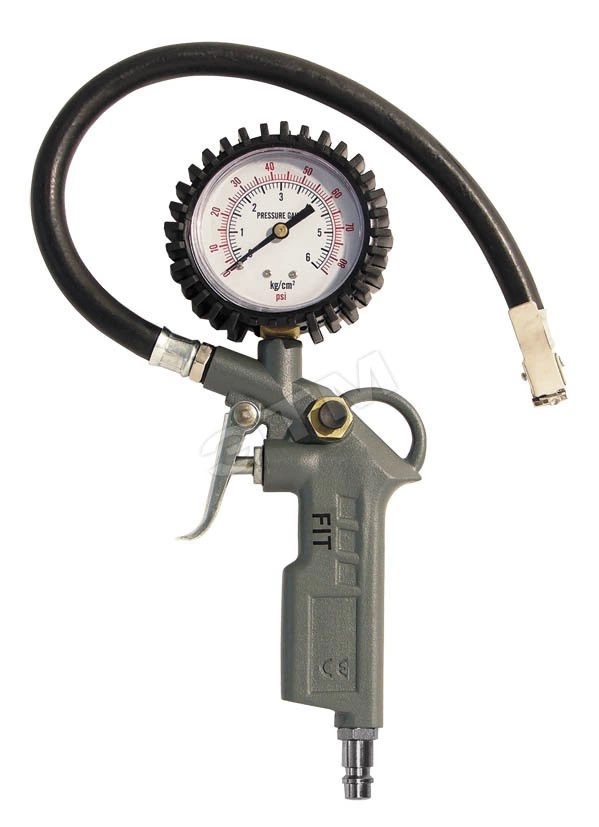 Пистолет с манометром, до 6 атм, 0,1 атм. Материал - алюминий. Соединение быстросъемное. Измерительная шкала до 6 атмосфер, с шагом 0,1атмосферы, диаметр выходного отверстия (ниппель)1/4', продольное расположение манометра. Используется для контроля давления при подаче воздуха.