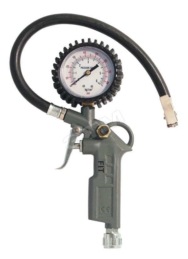Пистолет с манометром, до 6 атм, 0,1 атм. Материал - алюминий. Соединение байонет. Измерительная шкала до 6 атмосфер, с шагом 0,1 атмосферы, диаметр выходного отверстия (ниппель) 1/4', продольное расположение манометра. Используется для контроля давления при подаче воздуха.