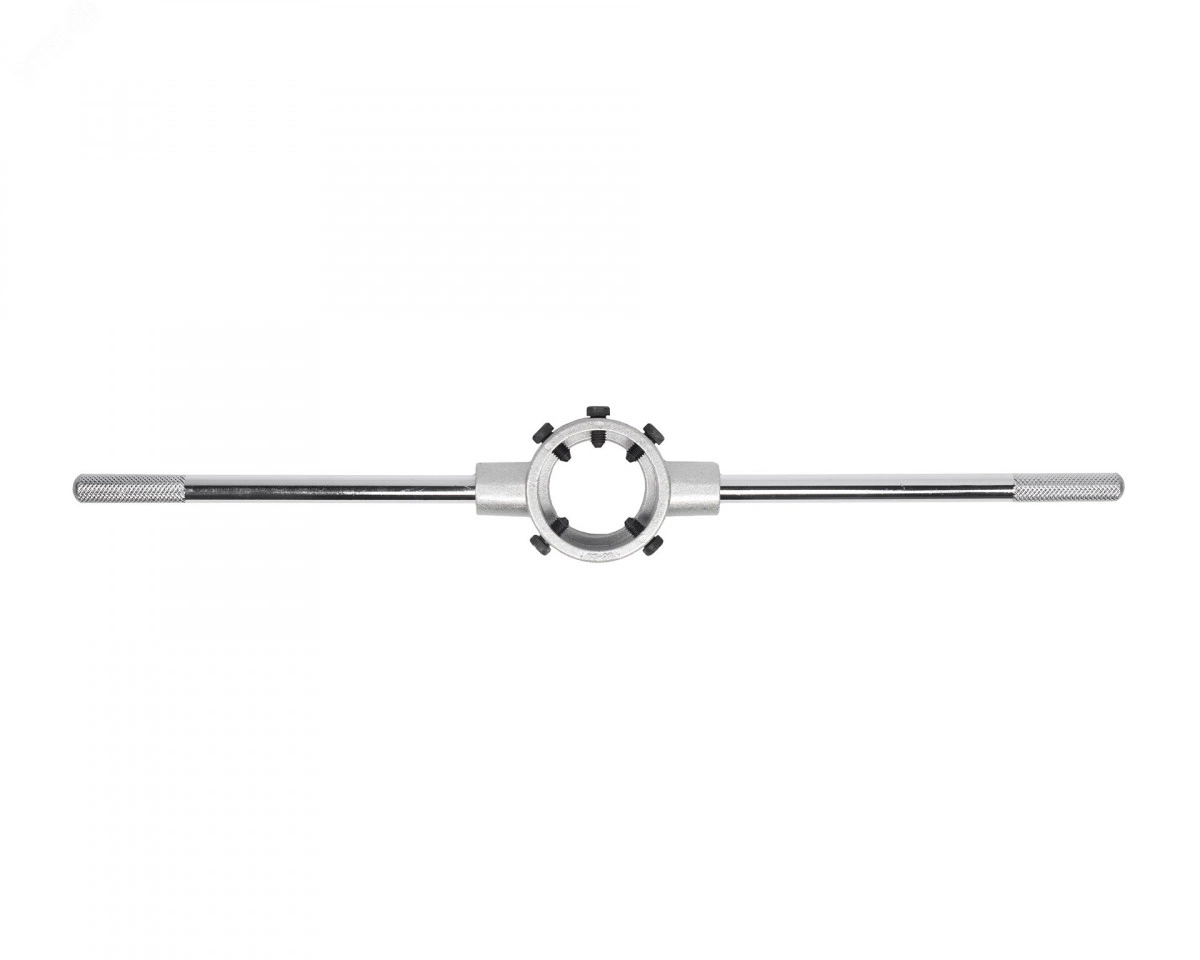 Плашкодержатель надежно удерживает инструмент для нарезания наружной резьбы. Благодаря рифленым рукояткам вращать держатель проще. Центральное отверстие имеет оптимальный размер, который позволяет расположить плашку одного размера без перекоса и погрешности.