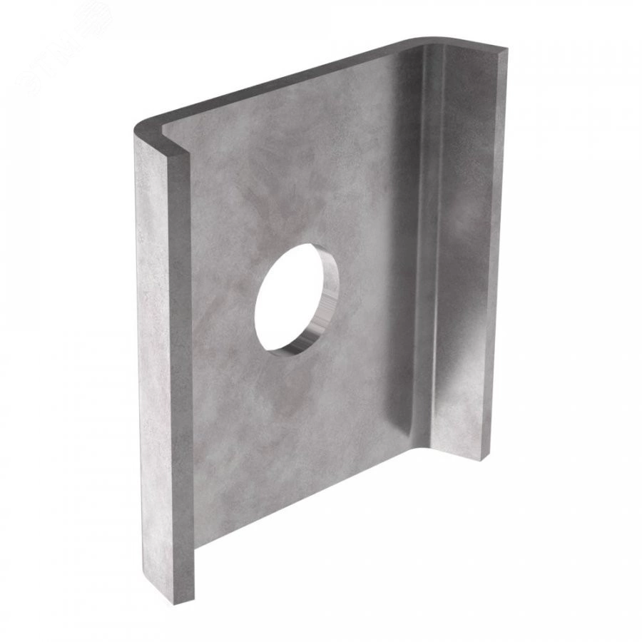Пластина с одним отверстием, диаметром 13 мм, представляет собой квадрат размерами 50*50 мм с двумя скругленными краями, толщиной 2,5 мм, вес 0,04 кг. Защищена от коррозии цинковым покрытием, нанесенным методом горячего цинкования. Применяется для присоединения к монтажному профилю различных элементов при помощи хомутов или резьбовых шпилек.