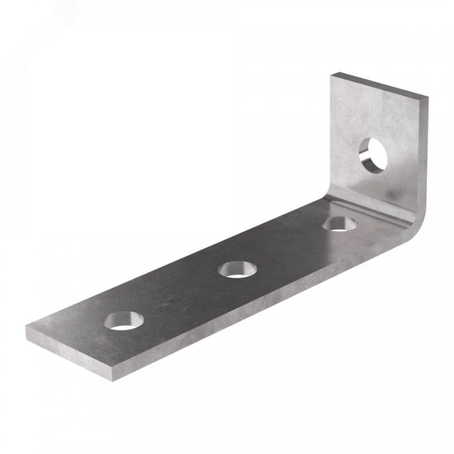 Пластина угловая 90 градусов 4 отверстия - Г-образного вида металлическая пластина толщина материала 5 мм. одно круглое отверстие на коротком плече, три отверстия на длинном плече d