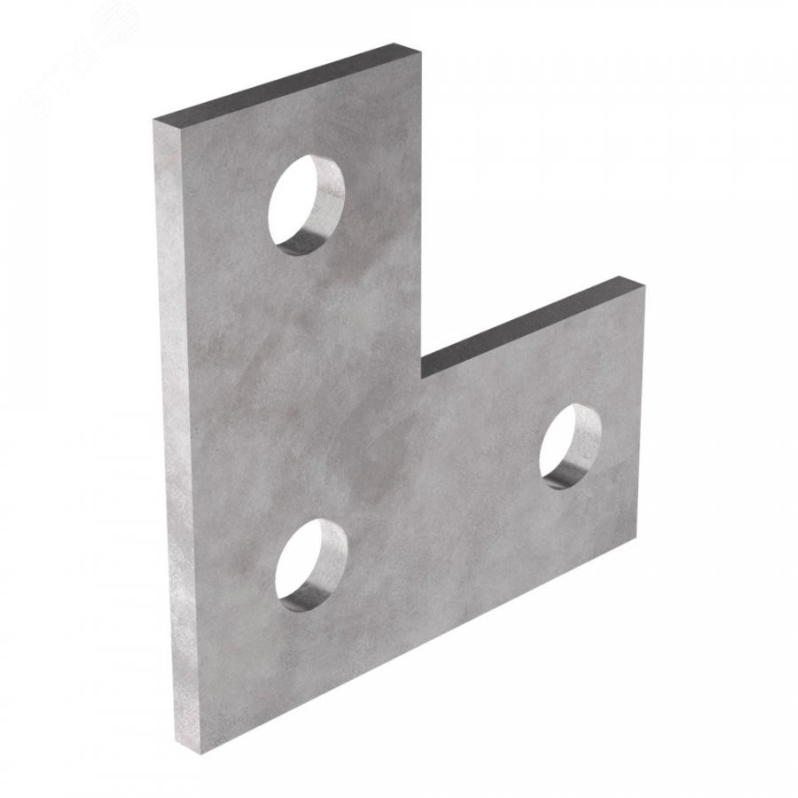 Пластина L-образная, с тремя круглыми отверстиями, диаметром 13 мм, размерами 86х135 мм и толщиной 5 мм, вес 0,33 кг. Защищена от коррозии цинковым покрытием, нанесенным методом горячего цинкования. Используется для соединения между собой различных элементов монтажных профилей без использования сварки, с помошью специальных монтажных крепежей.