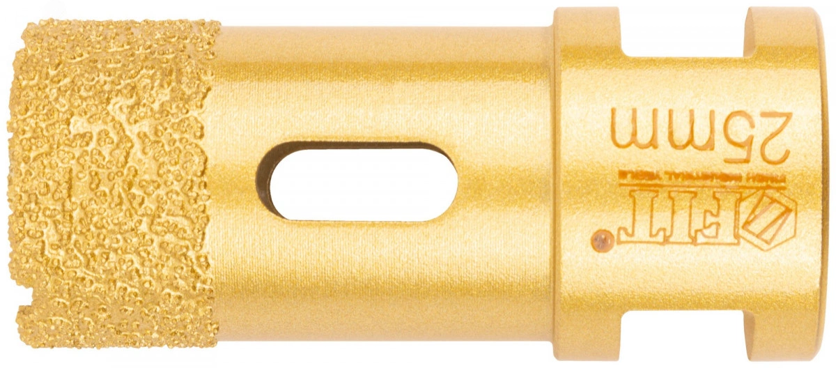 Профи. Хвостовик М14. Для вырезания круговых отверстий в керамограните, кафельной плитке, бетоне, граните, мраморе, кирпиче, стекле. Сухое и влажное сверление. Глубина пропила 40 мм. Для углошлифовальных машин. Технология вакуумного спекания обеспечивает большую твердость и более длительный срок службы коронки. Внутри коронок 16331-16334 находится воск для охлаждения при работе. Материал - инструментальная сталь, режущая кромка содержит порошок из технических алмазов. Упаковка - пластиковая туба.