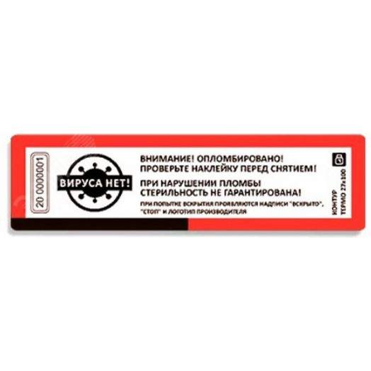 "Представляет собой самоклеющуюся этикетку на специальной подложке, выполненную из полиэстера с высокоадгезивным клеевым слоем. На наклейке нанесена дополнительная надпись ВИРУСА НЕТ. При попытке отклеивания от опломбируемой поверхности проявляются надписи """"Вскрыто"""", не исчезающие при повторном наклеивании. Наклейка оставляет след на опломбируемой поверхности. Идеально подходит для пломбирования любых поверхностей."