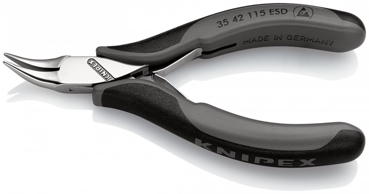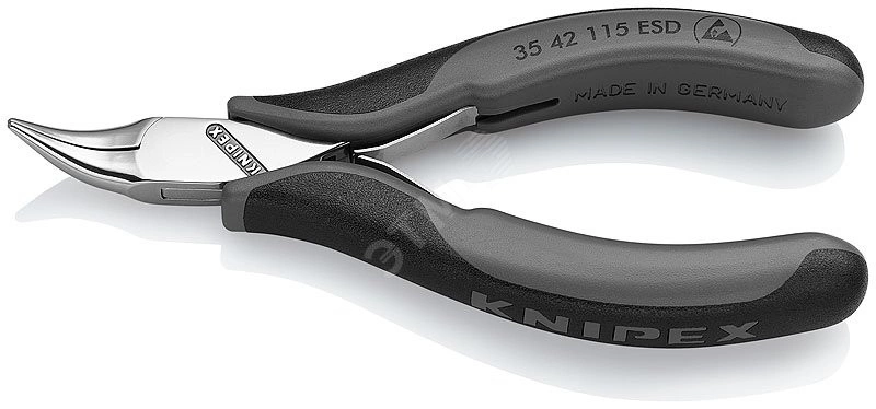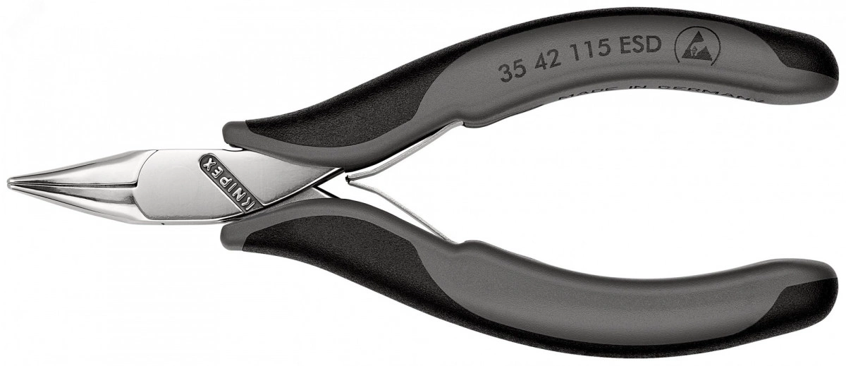 35 42 115 ESD Плоскогубцы захватные для электроники антистатические прецизионные плоскогубцы для самых тонких монтажных работ, например, в электронике и точной механике. для захвата, фиксации и изгибания. ручки электроотводящие с рассеянием. коробчатый прецизионный шарнир. плоскошлифованные захватные плоскости. кромки тщательно зачищены от заусенцев. плоская двуперая пружина с малым трением. финишная отделка - зеркальная полировка в сочетании с тонкой масляной пленкой обеспечивает хорошую защиту от коррозии. ручки с двухцветными многокомпонентными чехлами серо-черного цвета. губки плоско-круглые, наклонены под углом 45°. - Длина губок (B) - 22,5mm - Толщина губки (шарнир) (D) - 6,5mm - Ширина наконечников (E) - 2,0mm - Tip Thickness (F) - 1,5mm - Ширина головки (A) - 11,0mm - Размер - Угол - 45 - антистатический инструмент - да