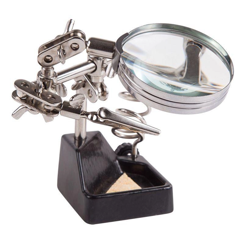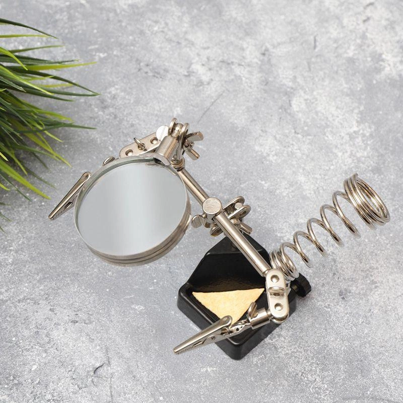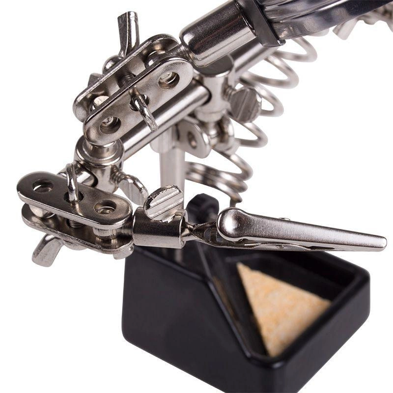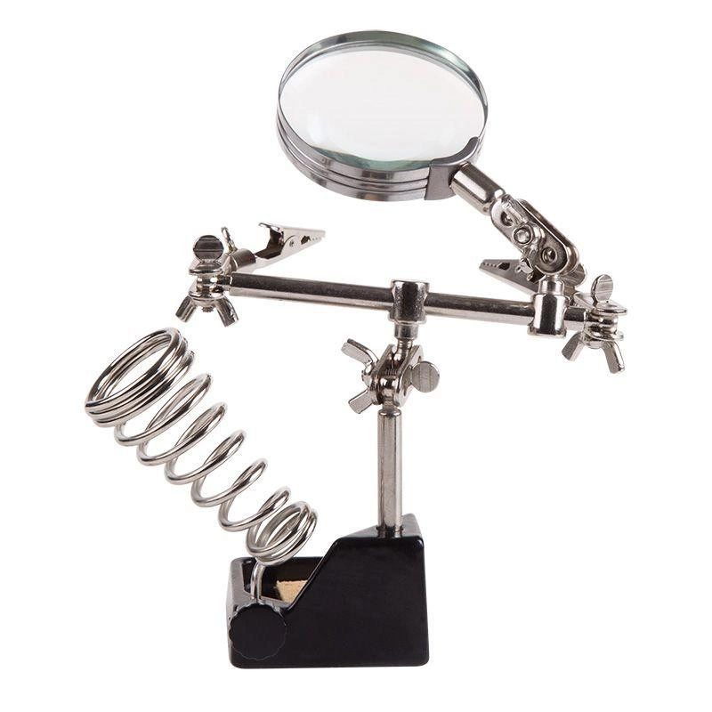 Инструмент состоит из чугунного основания (тяжелая подставка с нишей для губки, мелких деталей или припоя), шарнирного соединения с зажимами типа «крокодил» (подвижных во всех плоскостях) с никелевым покрытием, лупы с 2.5-кратным увеличением (возможность регулировки положения, диаметр линзы 60 мм) и спиралевидной подставки под паяльник.