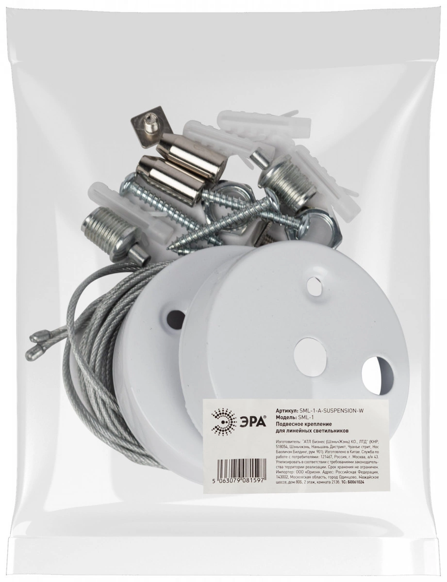 Комплект креплений для магистральных светильников ЭРА SML. В крепёжный набор входят 2 комплекта креплений - для накладного и подвесного монтажа. Длину троса при подвесном монтаже можно регулировать (максимальная длина подвеса светильника - 1 метр). ЭРА SML - магистральные светодиодные светильники с возможностью креативного соединения. Позволяют реализовать смелые дизайнерские задачи в рамках светового оформления. На потолке и стенах можно создавать креативный LED-рисунок - квадраты, буквы, пчелиные соты, кристаллические решетки и многое другое. Соединяются в линию или под углом (с раздельным питанием). Выпускаются в двух цветах корпуса – чёрном и белом. В комплекте с каждым светильником – крепёж для удобного и быстрого монтажа, а также детали для последовательного соединения. Для создания уникальных LED-рисунков отдельно приобретаются светодиодные модули - треугольные или квадратные.