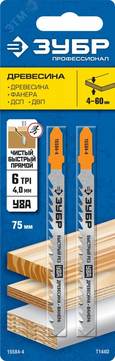 Полотна для эл/лобзика, T144D, У8А, по дереву, Т-хвостовик, шаг 4мм, 75мм, 2шт.