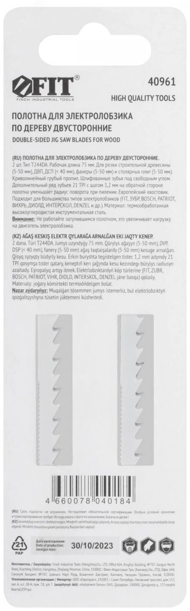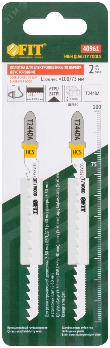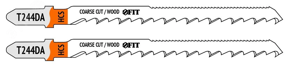 Полотна для электролобзика FIT HQ предназначены для резки строительной древесины, ДВП, ДСП, ламината, фанеры, столярных плит. Пропил — криволинейный, грубый. Толщина реза — 5–50 мм. Закалка полотна до твердости 50–52 HRC обеспечивает высокую износостойкость. Шаг зубьев 4,2 мм (6 TPI) способствует высокой скорости и эффективности реза. Дополнительный ряд зубьев с шагом 2,5 мм на обратной стороне полотна уменьшает радиус поворота при пилении. Шлифованные под свободным углом зубья без разводки повышают точность реза. Специальная узкая форма полотна дает возможность осуществлять как прямой, так и криволинейный рез. Т-образный хвостовик европейского типа совместим с большинством моделей электролобзиков.