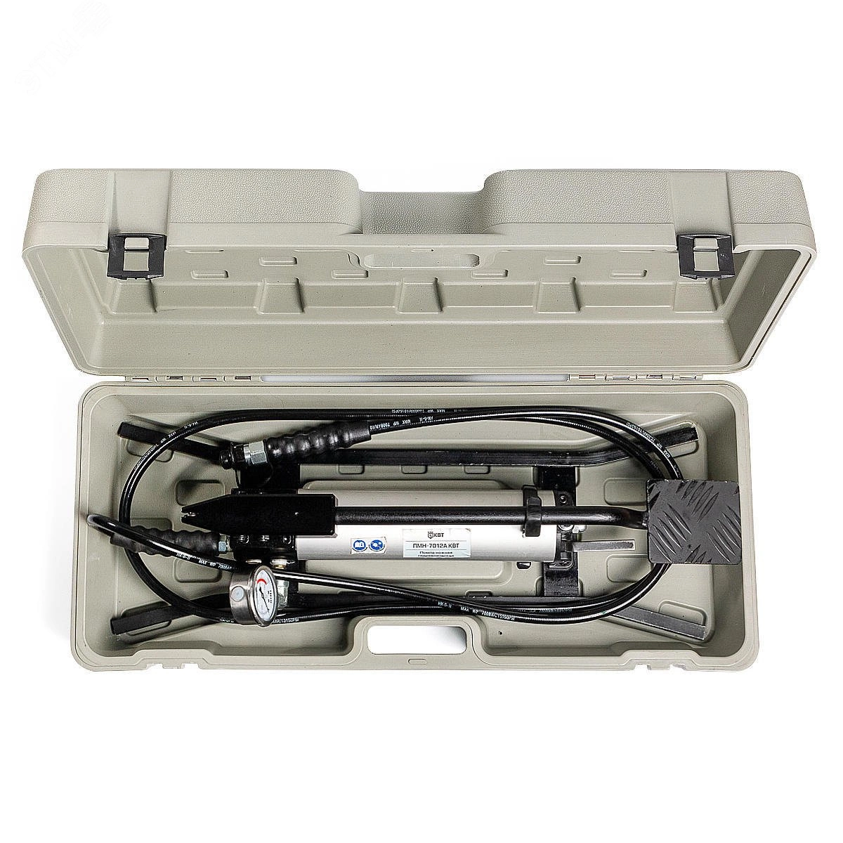 В комплекте - гидравлическая помпа ПМН-7012А. встроенный виброустойчивый манометр, рукав высокого давления длиной 3.00 м. пластиковый кейс 770х340х210 мм Увеличенный объем маслобака - 1.20 л. Корпус маслобака изготовлен из легкого алюминиевого сплава. Ножной рычаг принудительного сброса давления обеспечивают полное управление помпой во время работы. Встроенный манометр обеспечивает контроль за давлением помпы во время работы. Максимальное давление - 700 бар (70 МПа). Механизм автоматического сброса давления (АСД). Двухступенчатое нагнетание давления. Присоединительная резьба на конце РВД - K 3/8' 'вилка' по ГОСТ 6111-52. Эргономичный уклон площадки ножной педали. Всесезонное гидравлическое масло 'КВТ' гарантирует работу инструмента при температуре выше минус 15 градусов по Цельсию. Каркасная рамка, обеспечивающая устойчивое положение помпы при работе. Вес инструмента - 8.00 кг / Вес комплекта - 12.30 кг. Упаковка - прочный пластиковый кейс