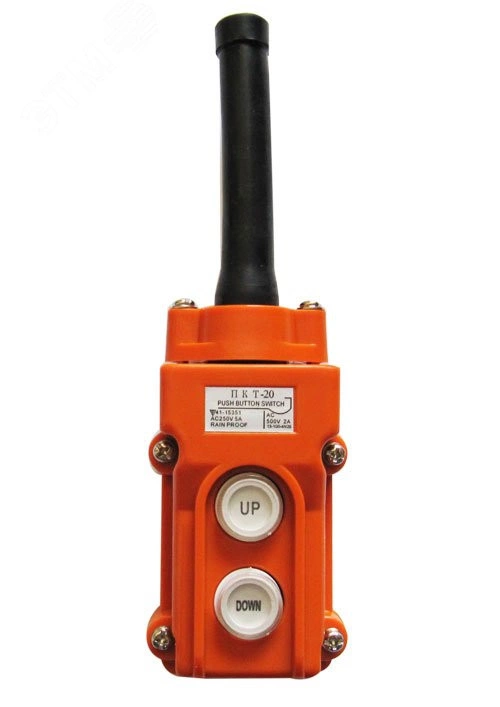 ПКТ-20 пост кнопочный (состоит из двух кнопок). Посты управления кнопочные серии ПКТ предназначены для дистанционного управления с пола реверсивными и нереверсивными электромагнитными пускателями и контакторами электрических талей с односкоростными и двухскоростными электродвигателями в электрических цепях управления напряжением до 220. Корпус ПКТ выполнен из термостойкой ABS-пластмассы, которая является негорючим материалом (оранжевого цвета).