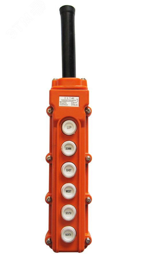ПКТ-60 пост кнопочный (состоит из шести кнопок). Посты управления кнопочные серии ПКТ предназначены для дистанционного управления с пола реверсивными и нереверсивными электромагнитными пускателями и контакторами электрических талей с односкоростными и двухскоростными электродвигателями в электрических цепях управления напряжением до 220. Корпус ПКТ выполнен из термостойкой ABS-пластмассы, которая является негорючим материалом (оранжевого цвета).