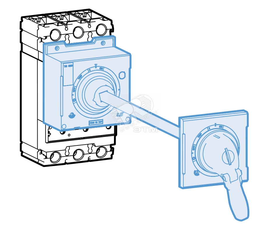 Поворотная рукоятка для управления выключателем выпускается как в стандартном , так и в выносном исполнении для установки на двери щита. Рукоятка всегда оснащается замком для блокировки двери щита. Существуют исполнения рукоятки - левое (L), правое (R), по центру (S)