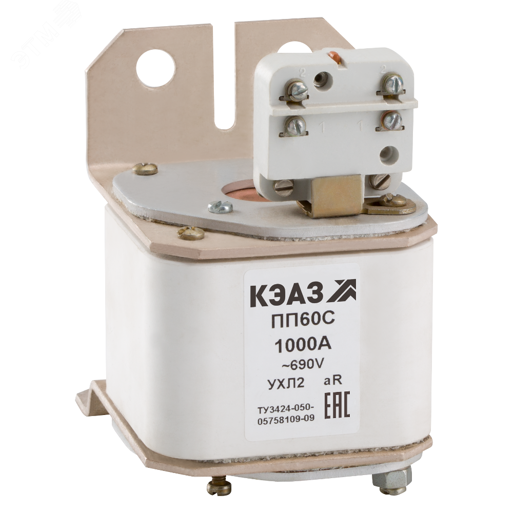 Предохранитель на номинальный ток 1000 А. Быстродействующие предохранители плавкие КЭАЗ серии ПП60С на номинальное напряжение переменного тока 690В предназначены для защиты полупроводниковых тиристорных электроприводов, выпрямителей для электролиза и других типов преобразовательных устройств, при этом предохранители на номинальный ток 710 и 1000 А могут использоваться также и для применения на электроподвижном составе. Предохранители плавкие ПП60С включены в Реестр промышленной продукции, произведенной на территории Российской Федерации.