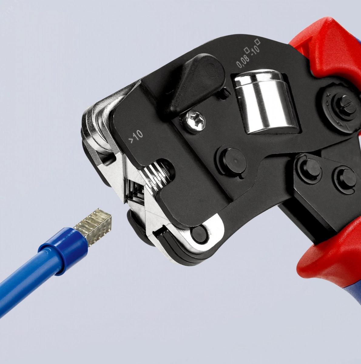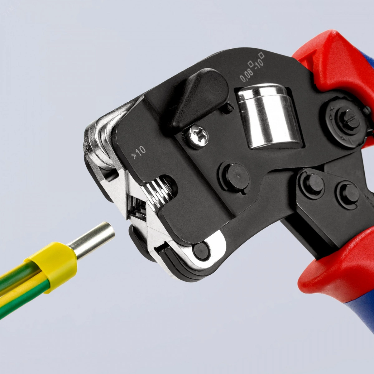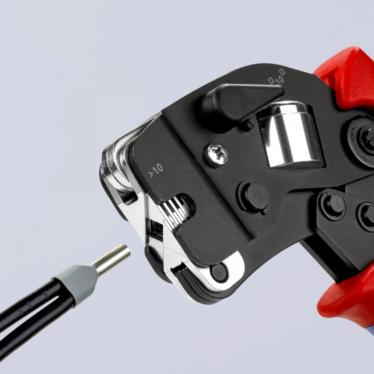Самонастраивающиеся пресс-клещи для опрессовки контактных гильз для опрессовки контактных гильз (по стандарту DIN 46 228 часть 1 + 4). саморегулирующаяся настройка на нужный размер контактной гильзы - исключаются ошибки опрессовки из-за неверного выбора опрессовочной плашки. Вставка втулок в клещи спереди. неизменно высокое качество опрессовки за счет принудительной блокировки (с отпиранием). усилие опрессовки точно откалибровано изготовителем. высокая передача усилия благодаря рычажному механизму, для снижения усталости при работе. инструмент удобен в использовании благодаря продуманной конструкции и малому весу. oпрессовка в диапазоне поперечных сечений 0,08 -10,0 мм.кв и 16,0 мм.кв в одной матрице. с рычагом выбора для установки диапазона опрессовки 0,08 - 10 или 16,0 мм.кв. Для двойных втулок 2 x 10 мм.кв до диаметр 6,6 мм
