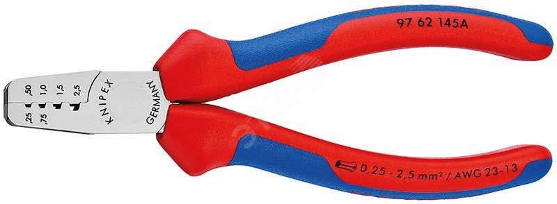 97 62 145 A Пресс-клещи для обжима контактных гильз для опрессовки контактных гильз (по стандарту DIN 46 228 часть 1 + 4) в диапазоне сечений от 0,5 до 2,5 мм?. Oпрессовка в маркированных трапециидальных профилях для надежного соединения гильзы и проводника. - Применение - гильзы контактные - Параметры кв.мм - 0,25-2,5mm? - Количество гнезд - 4 - AWG - 24-14