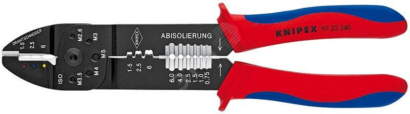 97 22 240 SB Пресс-клещи . с режущими выборками для резания медных или латунных резьбовых шпилек M 2,6, M 3, M 3,5, M 4 и M 5. винтовой шарнир для высокой стабильности и равномерности хода. карта самообслуживания/ блистер. - Применение - кабельные наконечники с изолятором + кабельные соединители - Параметры кв.мм - 0,5-6,0mm? - Количество гнезд - 3 - AWG - 20-10