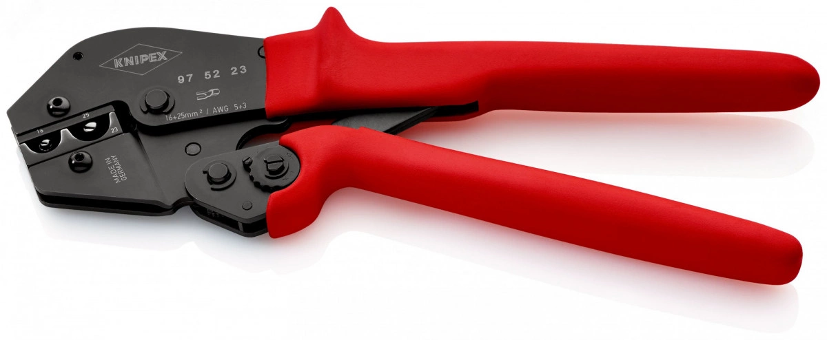 97 52 23 Пресс-клещи для опрессовки электрических контактов, без применения пайки. Применение рычажной передачи обеспечивает снижение необходимого для обжима усилия на 30% по сравнению со стандартными обжимными инструментами. Неизменно высокое качество опрессовки благодаря механизму принудительной блокировки (с отпиранием). усилие опрессовки точно откалибровано изготовителем. Работа двумя руками позволяет легко обжимать провода больших сечений. работать удобно благодаря сбалансированности, наклонной головке и эргономичным ручкам. - Применение - кабельные наконечники без изолятора + кабельные соединители - Параметры кв.мм - 16/ 25mm? - Количество гнезд - 2 - AWG - 6/ 4