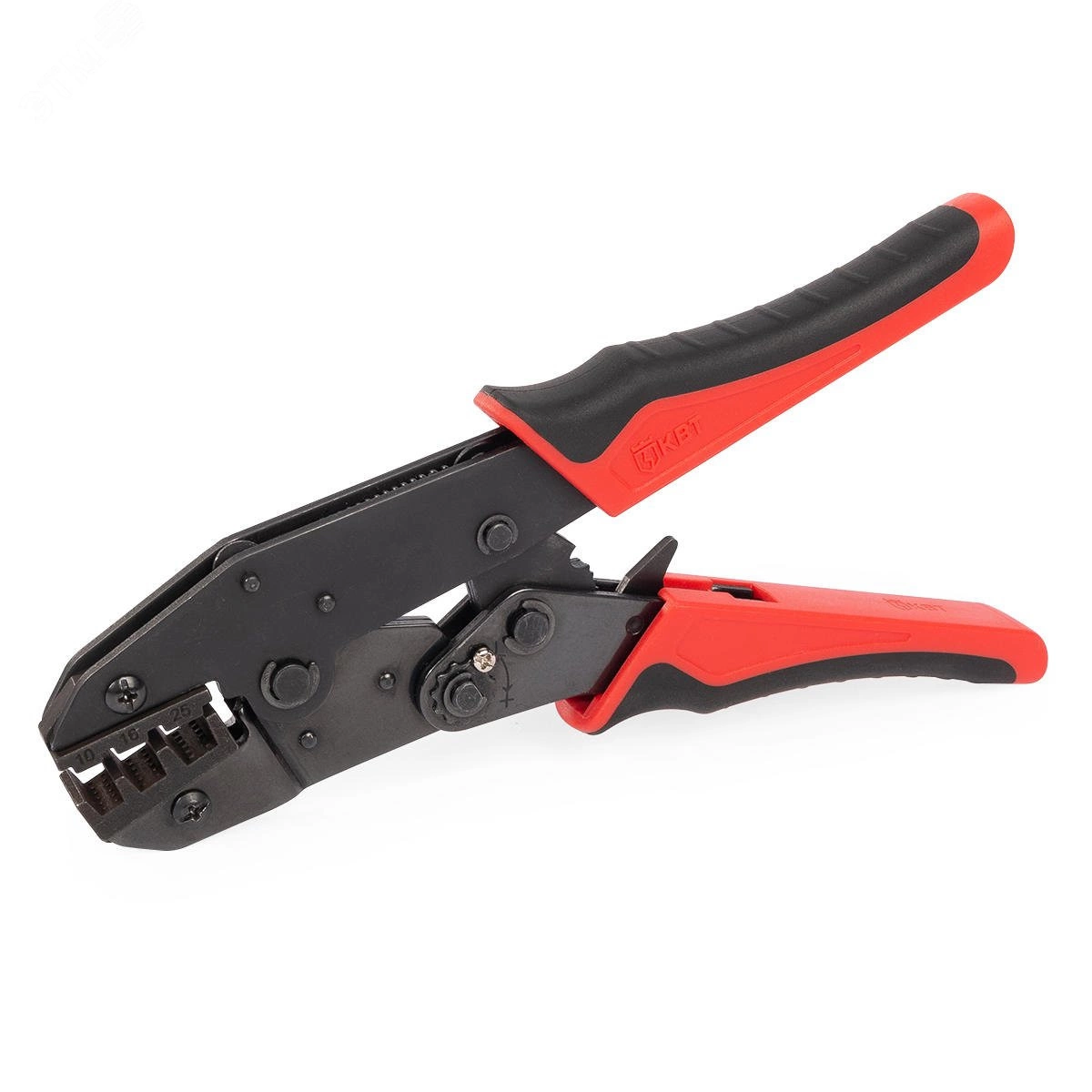 Классическая конструкция, надежная механика. Материал корпуса: качественная 3-миллиметровая сталь. Храповой механизм, обеспечивающий блокировку обратного хода до завершения полного цикла опрессовки. Клещи предназначены для опрессовки одинарных изолированных и неизолированных втулочных наконечников НШВИ, НШВ сечением от 10-25 миллиметров квадратных.