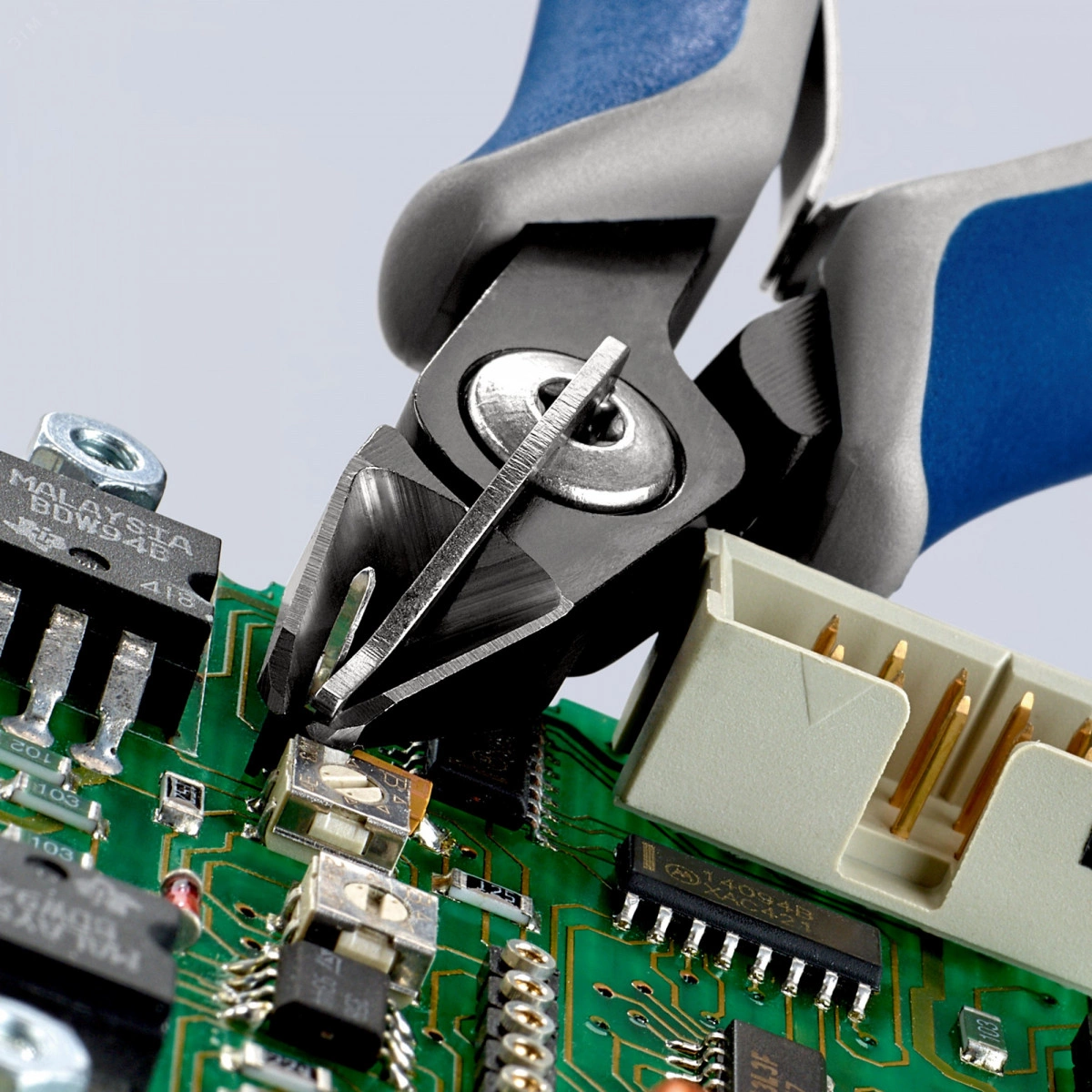 Прецизионные бокорезы для электроники кусачки прецизионные для самых тонких работ по резанию, например, в электронике и точной механике. точно шлифованные режущие кромки с очень малыми фасками для точной резки чувствительных деталей электроники, также без фаски для резки заподлицо. режущие кромки дополнительно закалены токами высокой частоты до твердости примерно 64 HRC. почти на 20 процентов меньший вес по сравнению с традиционными клещами для электроники. винтовой шарнир с особенно тщательно выполненными рабочими поверхностями для равномерного движения. двойная пружина с легким ходом. Эргономичные двухкомпонентные чехлы. острая головка. с зажимом для проволоки - никакого случайного отскока отрезанных кусков проволоки