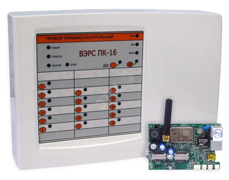 Охранно-пожарный прибор для шестнадцати зон сигнализации с возможностью дозвона и отправки SMS на телефоны пользователям или на мобильное приложение. Прибор выполнен в удобном пластмассовом корпусе с эргономичными кнопками на борту и информативными светодиодными индикаторами. Прибор поддерживает работу с любыми пороговыми пожарными и охранными извещателями. В составе прибора предусмотрен высокоэффективный импульсный основной источник питания сети 220В с расширенным диапазоном питающего напряжения, а также предусмотрено место под резервную АКБ на 12В с емкостью 4,5Ач, что позволяет прибору работать сутки при отключении основного источника питания. Прибор оснащен мощными цепями управления табличками ''Выход'' и сиренами, питающимися от 12В. Прибор умеет работать с микрофоном и термодатчиком, присылать уведомления по выходу из установленного диапазона температур.
