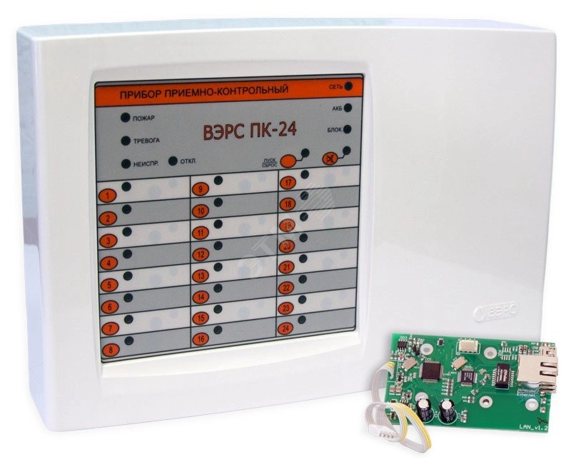 Охранно-пожарный прибор для 24 зон сигнализации, сертифицирован согласно актуальным требованиям ЕАЭС 043/2017. Прибор выполнен в удобном пластмассовом корпусе с эргономичными кнопками на борту и информативными светодиодными индикаторами. Прибор поддерживает работу с любыми пороговыми пожарными и охранными извещателями. В составе прибора предусмотрен высокоэффективный импульсный основной источник питания сети 220В с расширенным диапазоном питающего напряжения, а также предусмотрено место под резервную АКБ на 12В с емкостью 4,5Ач, что позволяет прибору работать сутки при отключении основного источника питания. Прибор оснащен мощными цепями управления табличками ''Выход'' и сиренами, питающимися от 12В. Магистраль RS-485 позволяет подключать дополнительные блоки реле, блоки управления внешними оповещателями, блоки клавиатуры. Работает в составе IP-ОПС ВЭРС-LAN.