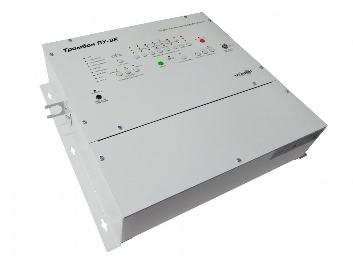 Прибор управления Тромбон ПУ-8К предназначен для построения системы оповещения и управления эвакуацией (СОУЭ) 3-го и 4-го типов. Оснащен встроенным усилителем мощности, системой резервного питания, 2 входами МЧС, гибкими настройками алгоритмов оповещения, интеллектуальной системой контроля всех линий связи, портом для подключения удаленных консолей Тромбон УК, интерфейсом RS-485 для подключения к ПК и сопряжения с системой безопасности АРМ ''Орион Про''. Для построения полноценной системы оповещения нужен только Тромбон ПУ-8К и речевые оповещатели ''Глагол''. Преимущества - - Звуковое оповещение о пожаре - Управление системами светового оповещения контроля доступа и эвакуационного освещения - Встроенные усилители мощности - Встроенный микрофон - Подключение до 8 Тромбон УК - 2 входа МЧС с квитированием - Выходная мощность 240 Вт (2х120 Вт) - Система резервного питания - Система сертифицирована согласно ТР ЕАЭС 043/2017 - Настенное исполнение