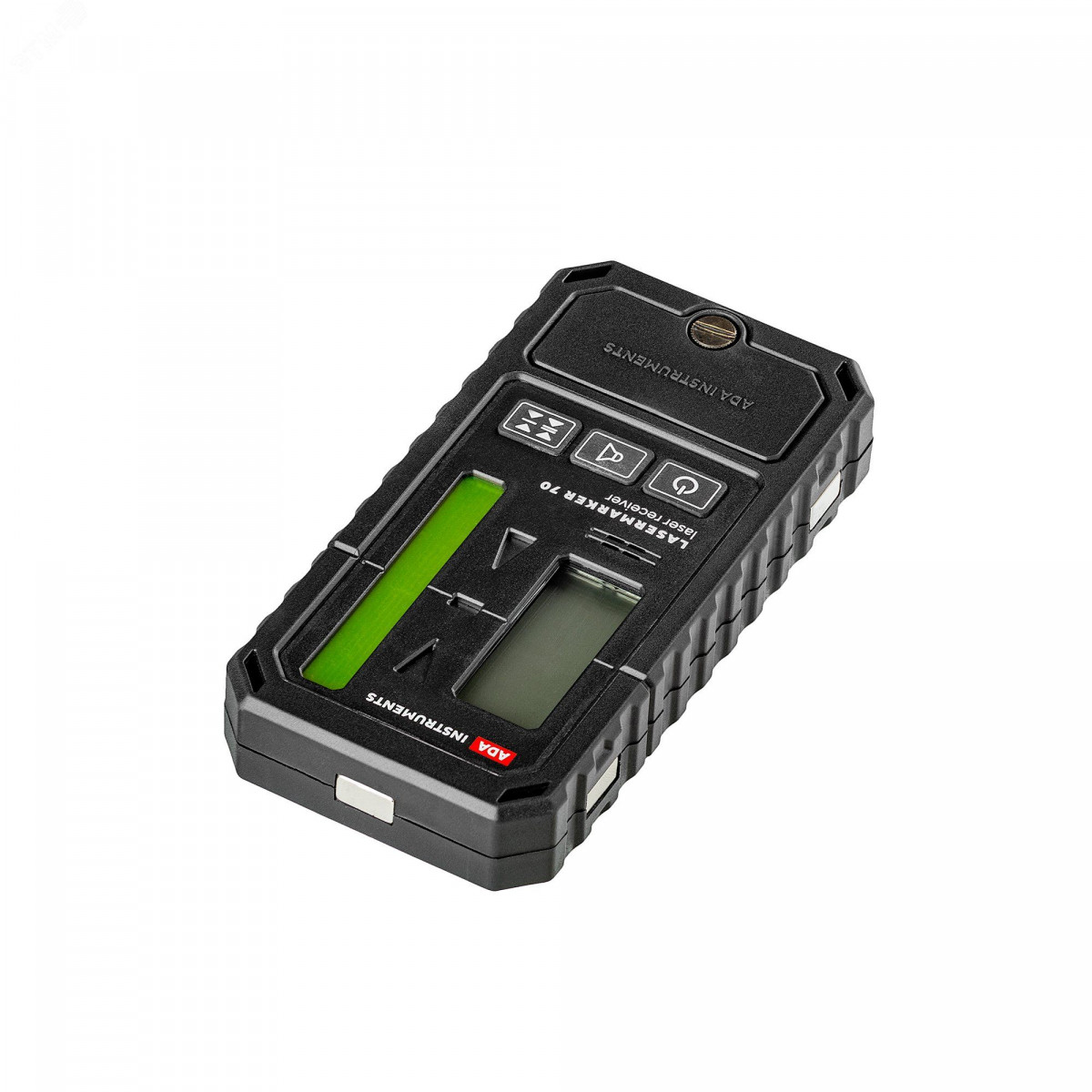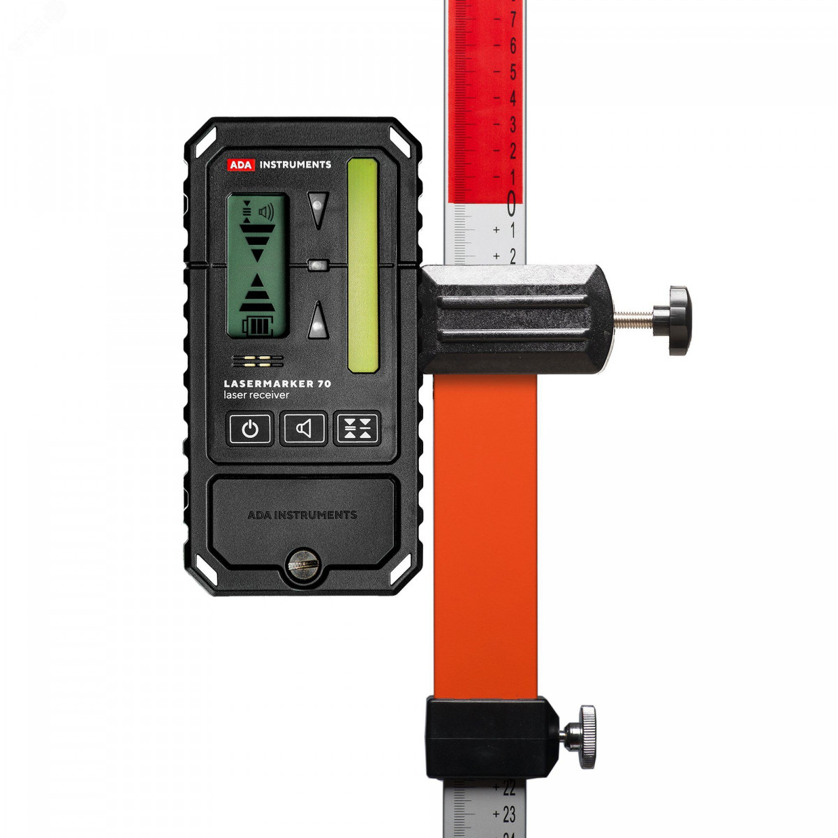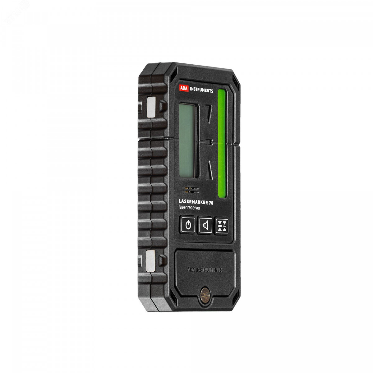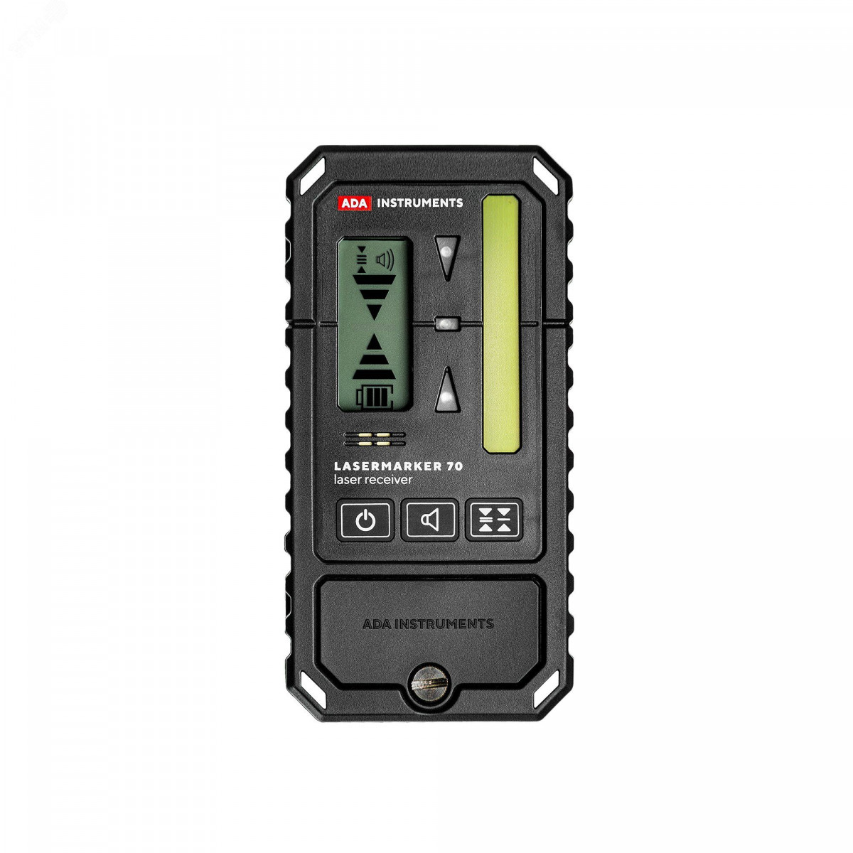 ADA LASERMARKER 70— универсальный приемник лазерного излучения служит для приема лазерного сигнала от линейного лазерного уровня имеющего режим работы с приемником. Предназначен для работы с лазерными уровнями ADA INSTRUMENTS и INSTRUMAX. Приемник ADA LASERMARKER 70 может работать с любыми лазерными уровнями имеющими режим работы с приемником. Параметры приемника можно изменить с помощью кнопочной панели. Приемник ADA LASERMARKER 70 распознает лазерные лучи зеленого и красного цвета. Большая (7 см) зона приемного элемента способствует быстро и уверенно обнаруживать положение лазерного луча. Вся информация выводится на ЖК дисплей. Работу в различных условиях освещения обеспечивает световая и звуковая индикация (дисплей и светодиоды).