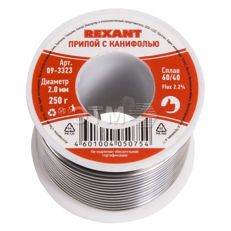 Припой с канифолью REXANT представляет собой проволоку (диаметром 2 мм) из сплава олова (60 %) и свинца (40 %). Используется в пайке для соединения деталей между собой и позволяет создать герметичный, механически прочный (устойчивый) шов. Нагреваясь до температуры плавления (183 до 188 градусов) припой - расплавляется, смачивает спаиваемый металл и, растекаясь по нему — заполняет место между соединяемыми деталями.