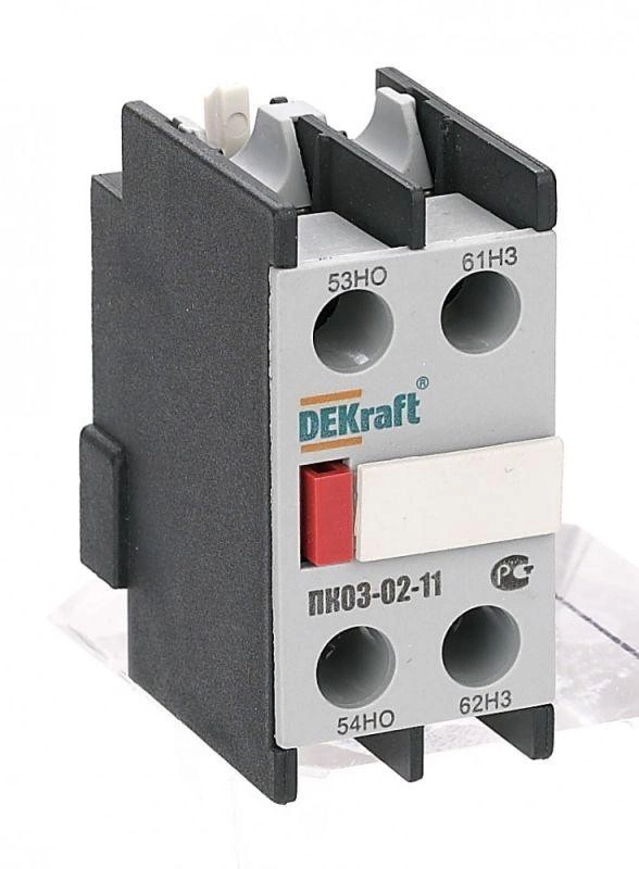 Приставка контактная серии ПК-03-02 для контакторов КМ-103 DEKraft; кол-во контактов - 1НО+1НЗ; ном.ток – 10 А; ном.напряжение – до 690 В; установка – с лицевой стороны; степень защиты – IP20. Приставки контактные предназначены для увеличения количества вспомогательных контактов контактора. Контактные приставки механически соединяются с контакторами и фиксируются при помощи защелки. Приставка подходит для использования с контакторами других производителей.