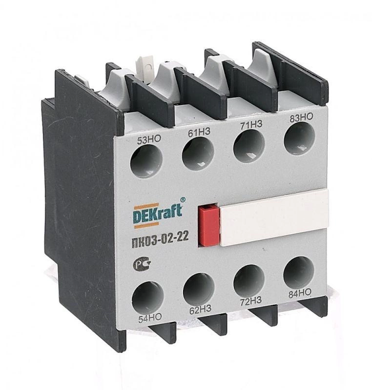 Приставка контактная серии ПК-03-02 для контакторов КМ-103 DEKraft; кол-во контактов - 2НО+2НЗ; ном.ток – 10 А; ном.напряжение – до 690 В; установка – с лицевой стороны; степень защиты – IP20. Приставки контактные предназначены для увеличения количества вспомогательных контактов контактора. Контактные приставки механически соединяются с контакторами и фиксируются при помощи защелки. Приставка подходит для использования с контакторами других производителей.
