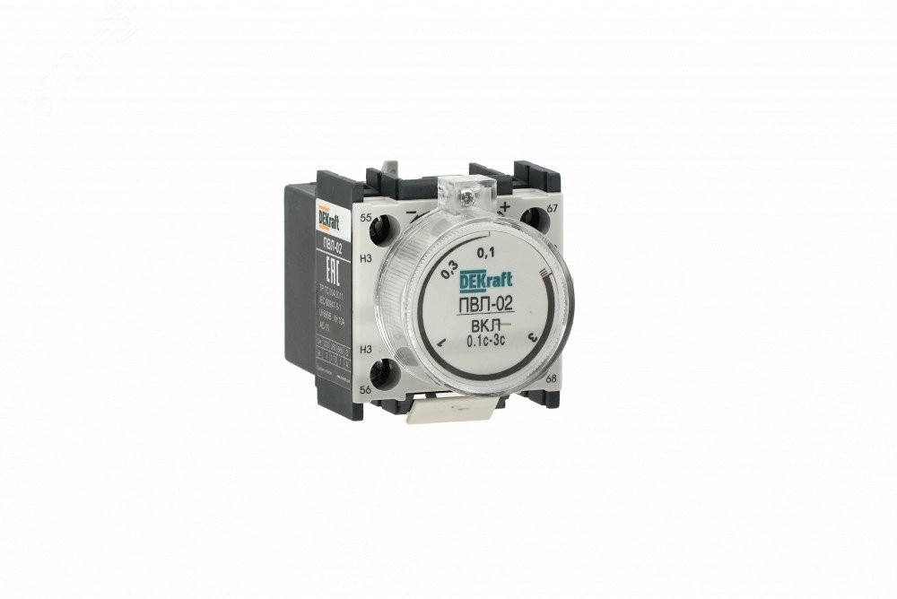 Приставка выдержки времени ПВЛ-02 для контакторов КМ-102 DEKraft, выдержка - 10…180 секунд, задержка - при включении, ном.ток 10 А, ном.напряжение до 690 В, монтаж защелкой на контакторе, степень защиты IP20. Приставки выдержки времени позволяют получить задержку замыкания или размыкания контактов цепи управления, например, в схема включения двигателя «звезда/треугольник, или для обеспечения паузы между циклами технологического процесса.