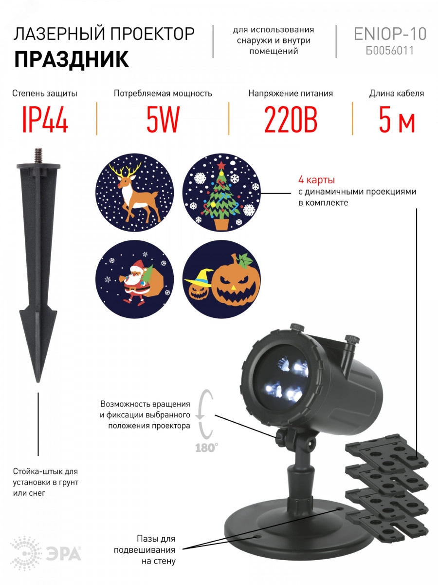 ЭРА ENIOP-10 - лазерный проектор для использования снаружи и внутри помещений. 4 карты с динамичными проекциями в комплекте (новогодний олень, ёлка, Дед Мороз и тыква). Вращение на 180 градусов для выбора и фиксации удобного положения. В комплекте есть пазы для подвешивания на стену и стойка-штык для установки в грунт или снег.