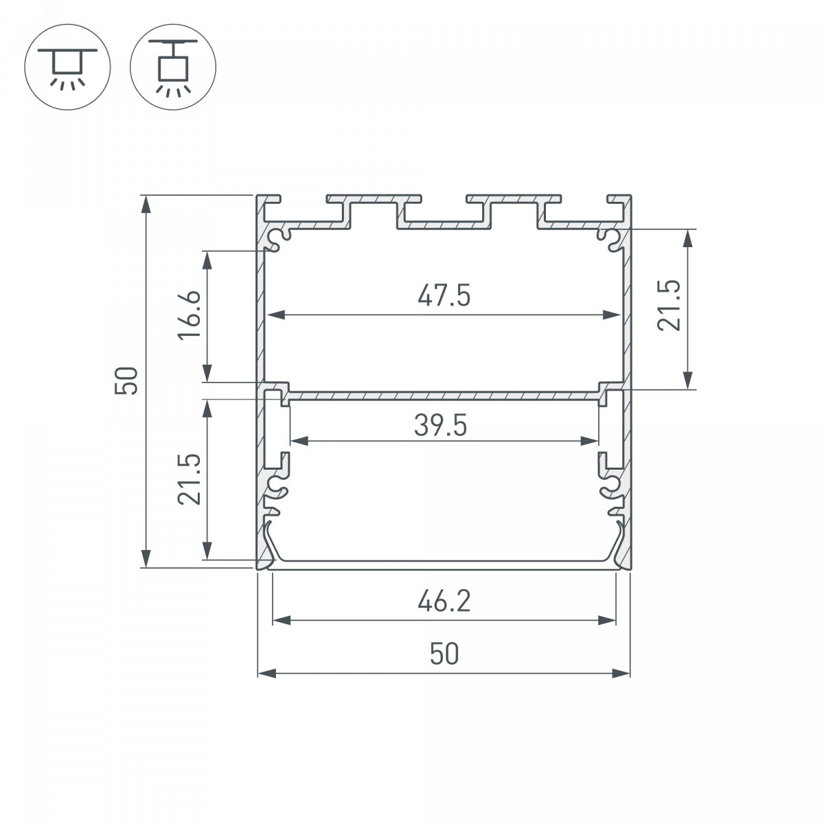 Подвесной/накладной профиль белого цвета из алюминия с отсеком для блока питания (39,5х21,5 мм для основного освещения и контурной подсветки. Габаритные размеры профиля составляют 2000 ммв длину, 50 ммв ширину и 50 ммв высоту. Площадка для установки светодиодных лент позволяет использовать ленту шириной до 39,5 мми мощностью до 52,5 Вт/м. Это обеспечивает гибкость в выборе светодиодных лент и создает потрясающие световые решения. Экраны, заглушки и другие аксессуары не включены в комплект и приобретаются отдельно. Цена указана за 1 метр профиля. Отличное решение для создания современных световых проектов. При изготовлении светильников длиной, превышающей длину профиля, соединители необходимо крепить к стенками профиля винтами с минимальным усилием, до первого ощущения сопротивления.
